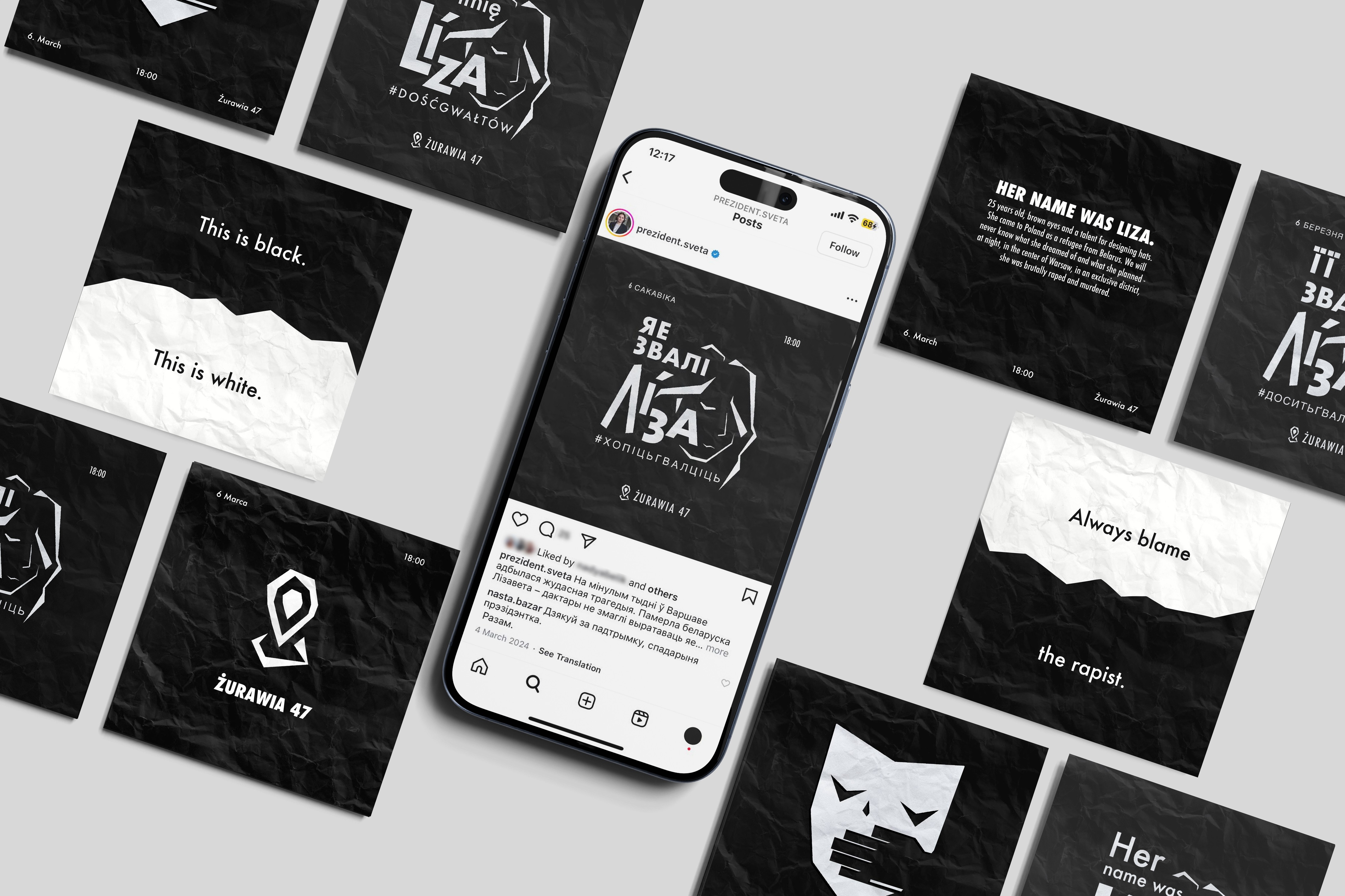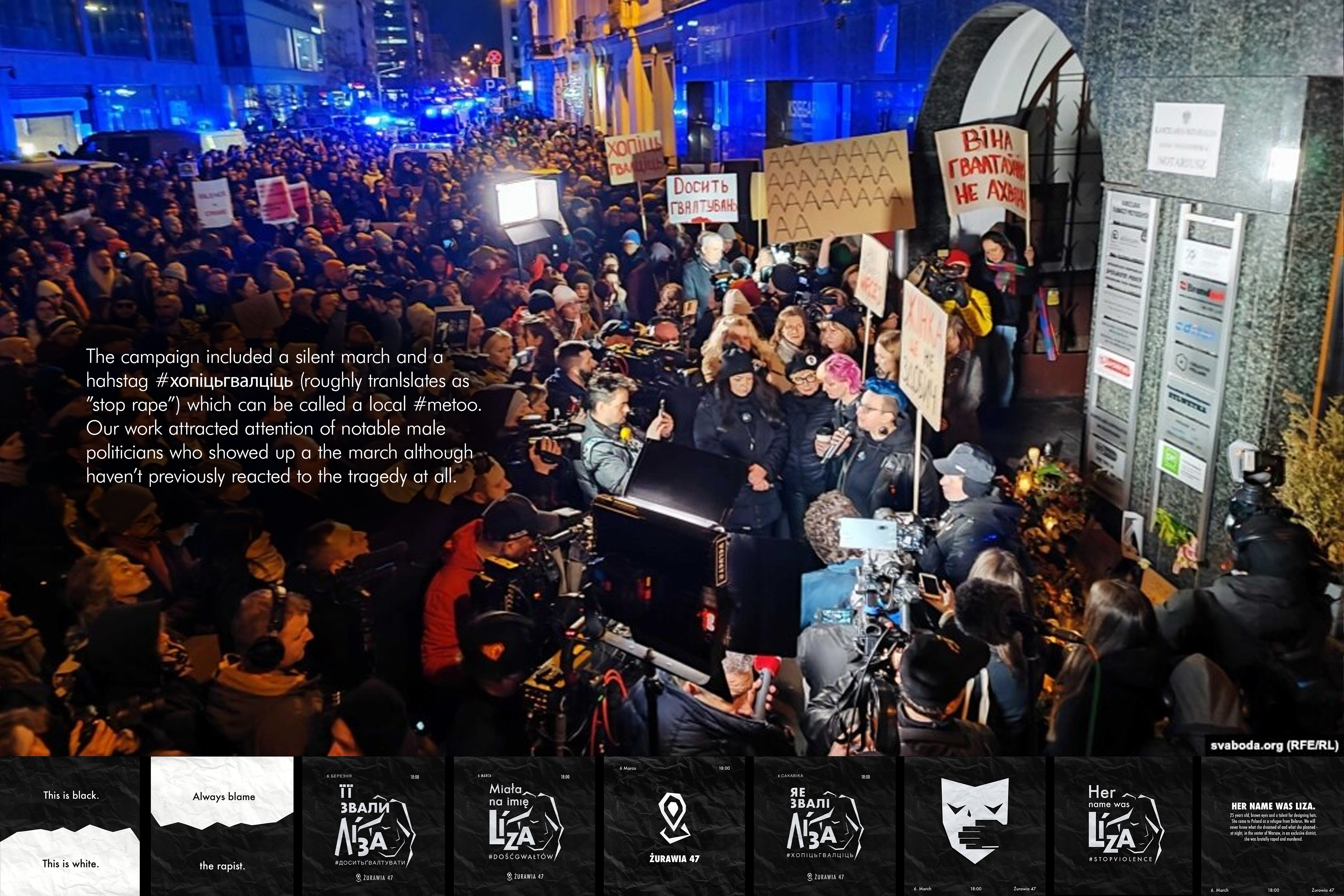 Nominated for “Human Rights Campaign/Initiative of the Year” 2024. All materials were created in under 24 hours because the campaign was a reaction to the tragic death of a rape victim in Warsaw. The logo is based on Liza’s portrait, but doesn’t resemble her face closely to allow her privacy.