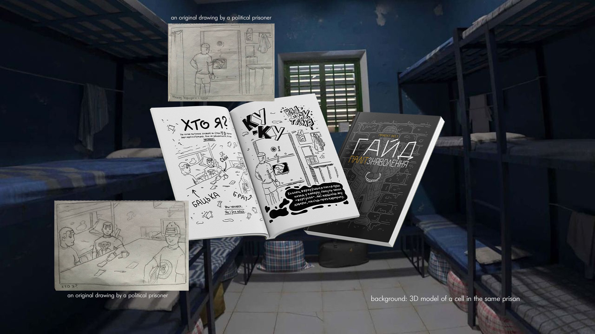 I designed the book contents, created the visual identity, and other materials based on original drawings. All texts in the book are handwritten to emphasize that letters are the only means of communication with the real world for political prisoners. Awarded a special prize by the PEN Centre in 2025, "For thorough work transforming personal and collective experience into artistic-documentary evidence." project361.org/en